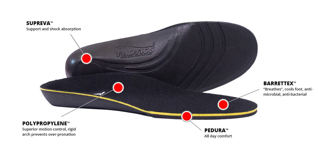 The PolypropyleneTM shell will support and cradle the arch while our SuprevaTM foam layer will give comfort and cushioning to impact and shock forces. A rigid arch will benefit most foot types while the extra thin shell allows for a better shoe fit.
