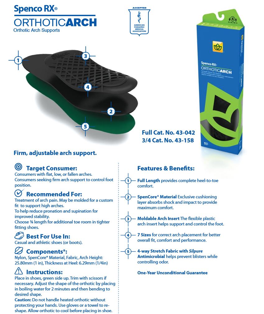 Firm Adjustable Arch Support Helps control, stabilize and balance the foot. Heat moldable for a custom fit. SpenCore® layer absorbs shock and reduces friction to improve overall foot comfort.