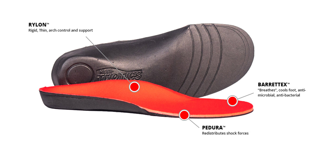 Flexible feet or Hallux rigidus? Look no further than Ultra Redi-Thotics. Our specially designed RylonTM shell provides the perfect amount of support and arch cradling, while the deep heel cup ensures stability. With an added neutral post for motion control and a peel n' stick met pad for metatarsalgia relief, these insoles have got you covered. Plus, our BarrettexTM top cover wicks away moisture and maintains a soft upper for ultimate comfort and dryness. Say goodbye to foot pain and hello to improved support and comfort with Ultra Redi-Thotics!