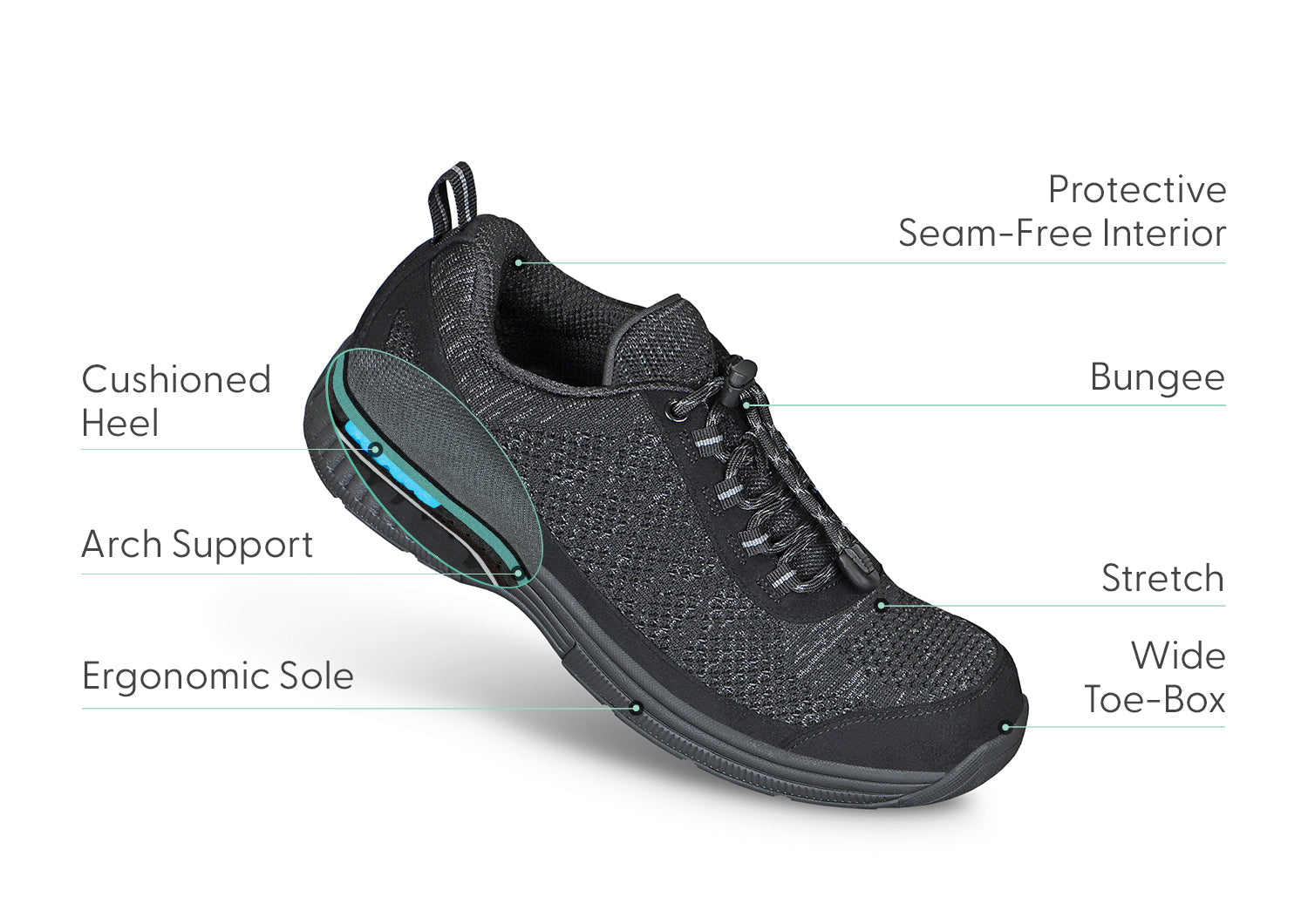 Stretchable, breathable fabric upper – provides ventilation and relaxed contoured fit that keeps pressure off conditions such as bunions, hammertoes and swollen feet, and protects sensitive feet, such as those with neuropathy, arthritis and diabetes.