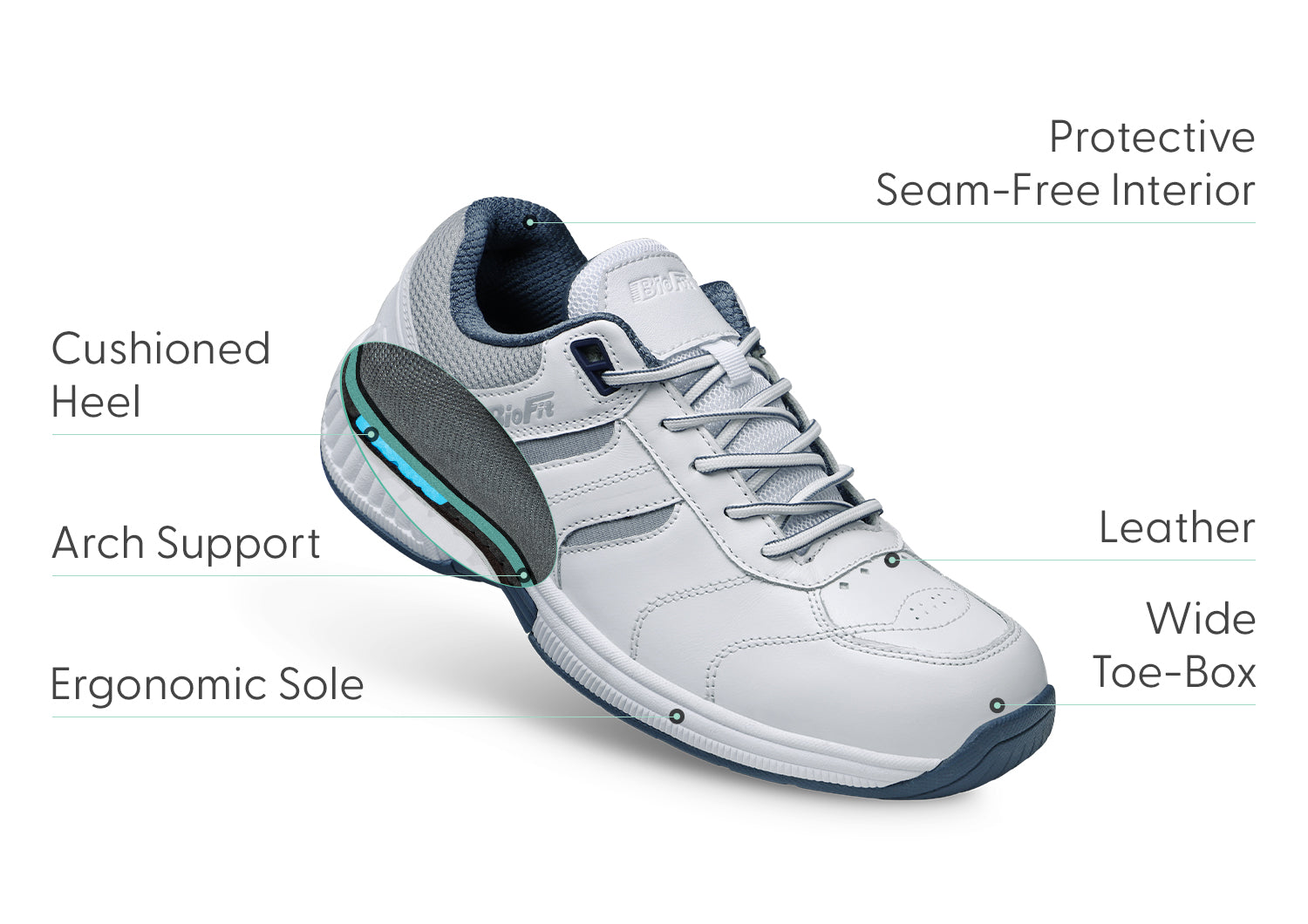 Despite its detailed leather upper, this durable and light classic sneaker is entirely smooth inside to keep feet free of irritation. The customized support of the Ortho-Cushion™ System improves alignment and absorbs impacts for easy walking comfort, while a roomy toe box takes the pressure off sensitive, wide or swollen feet, for unmatched, pain-free active performance.