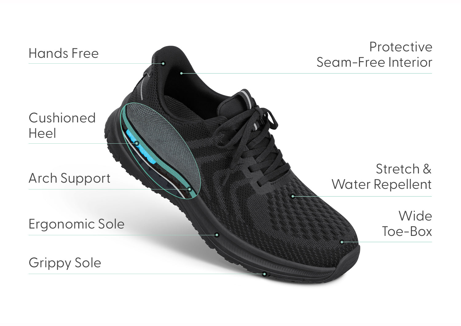 Patented slip-on technology – for hands-free on & off ease. Eliminates the need to bend over and tie or untie the laces. Great for anyone on the go, including those with knee pain, back pain or arthritis. Our revolutionary heel design keeps footwear from slipping off unexpectedly when walking or running.