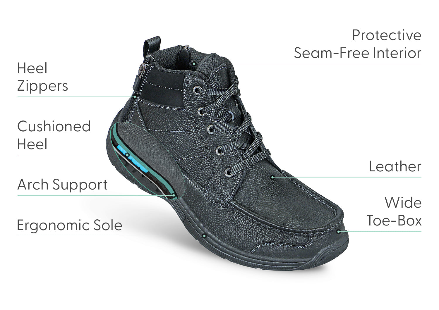 Soft, padded fabric interior with no overlays or seams. Eliminates irritation and provides superior protection for sensitive feet, including those with neuropathy and diabetes
