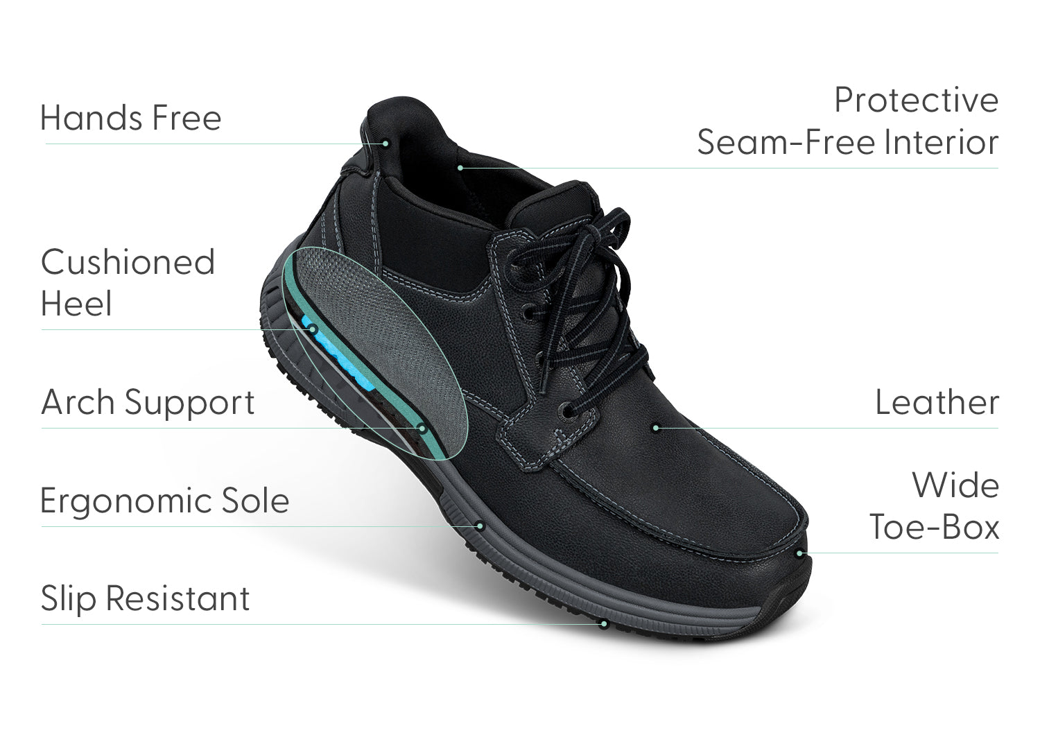 Get all the durability and ankle protection of great leather boots, with unheard of ease to put them on. Thanks to our patented hands-free technology you can forget about bending over to tie laces and just step in. Extra depth, a padded interior and a wide toe box ensure your feet enjoy a pressure free fit, with the Ortho-Cushion™ System that keeps long days pain-free.