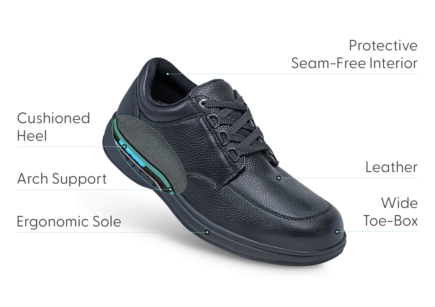 Tailored in supple and easy-to-clean full grain leather, Avery Island is a favorite for everyday versatility. Go farther in pain-free Ortho-Cushion™ System walking support and protection that's far from ordinary for any foot condition. Five available widths and a padded interior that offers extra depth and a wide toe box, ensure a customizable fit that extends all-day touring comfort.