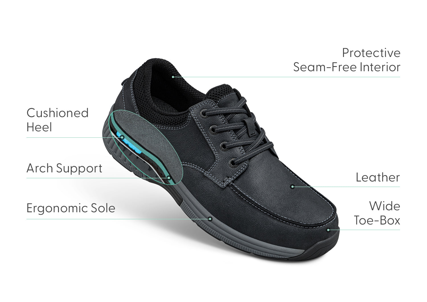 With knockabout good looks and a durable, flexible leather upper, Leo defends your walking comfort everywhere you go. A roomy, padded interior with adjustable depth and anatomical arch support provides customizable, irritation-free support. The cushioned Ortho-Cushion™ System insole, mild rocker design, and high-traction outsole take pressure off pain points and stabilize every step.