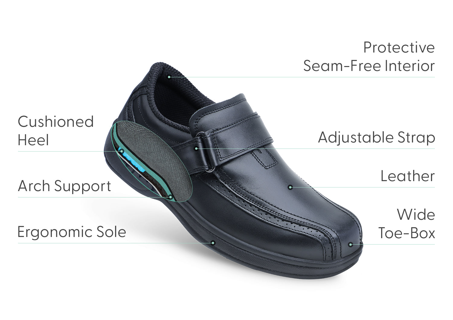 Wide toe-box alleviates pressure on swollen feet, bunions, and hammertoes and allows the freedom of natural foot movement