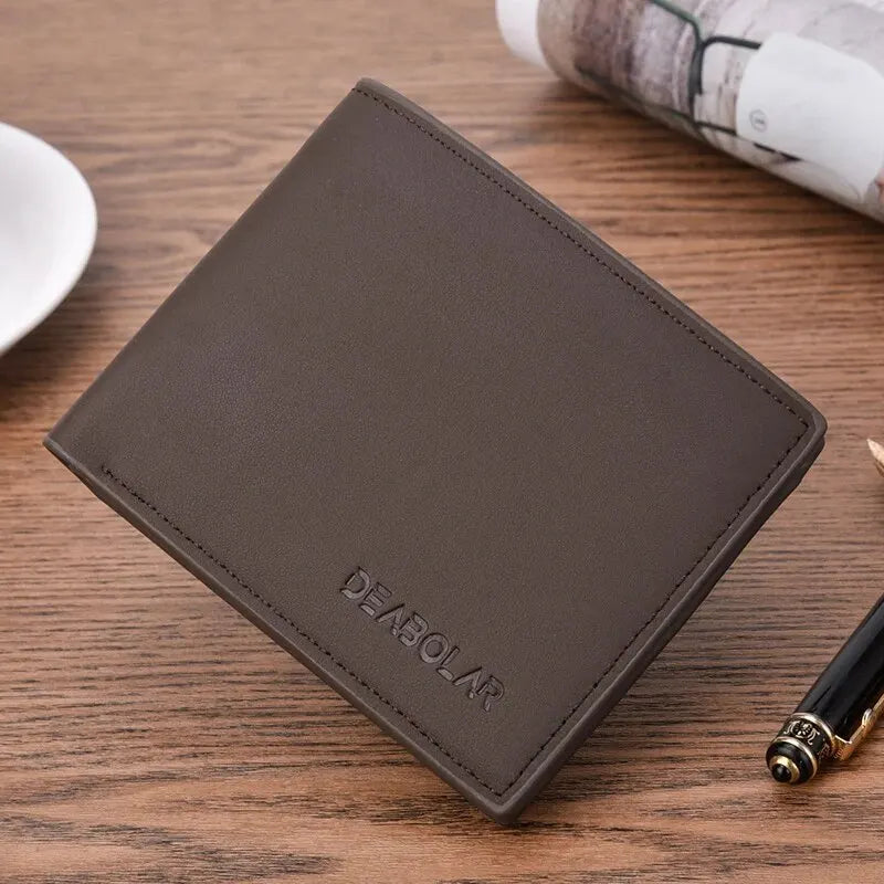 This wallet boasts a solid pattern and is designed with a standard size and multiple interior compartments for all your essentials. The sleek, short design, inspired by England style, is made with high-quality PU material and features a durable, no zipper closure. It's perfect for those who appreciate both style and functionality.