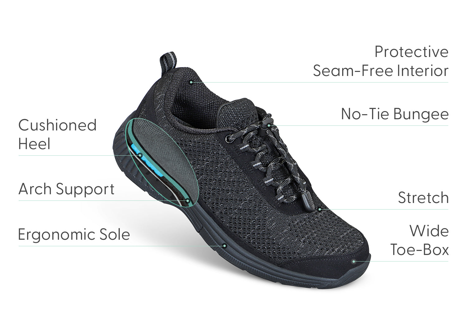 Stretchable, breathable fabric upper – provides ventilation and relaxed contoured fit that keeps pressure off conditions such as bunions, hammertoes and swollen feet, and protects sensitive feet, such as those with neuropathy, arthritis and diabetes.