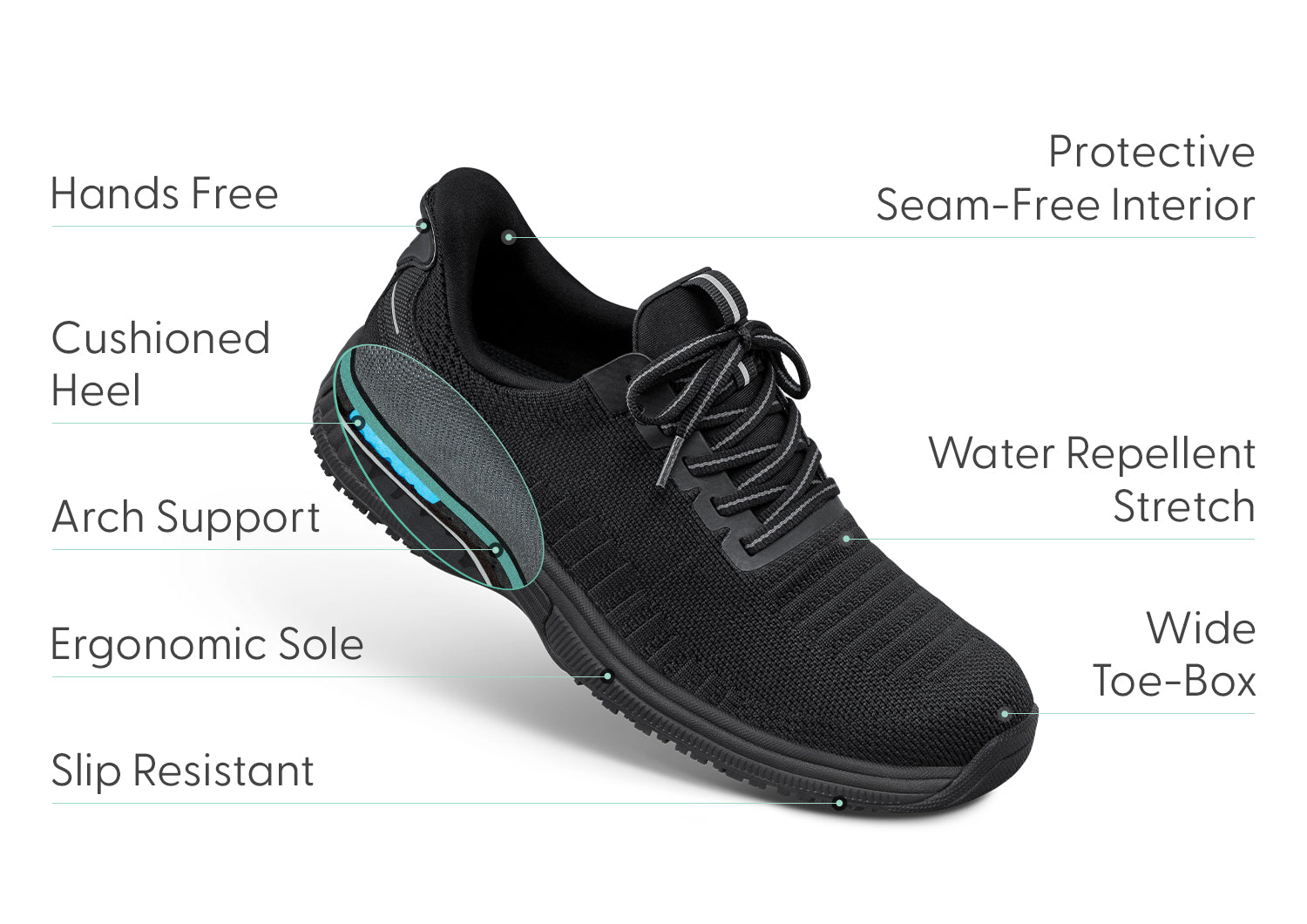 Patented slip-on technology – for hands-free on & off ease. Eliminates the need to bend over and tie or untie the laces. Our revolutionary heel design keeps footwear from slipping off unexpectedly when walking or running.