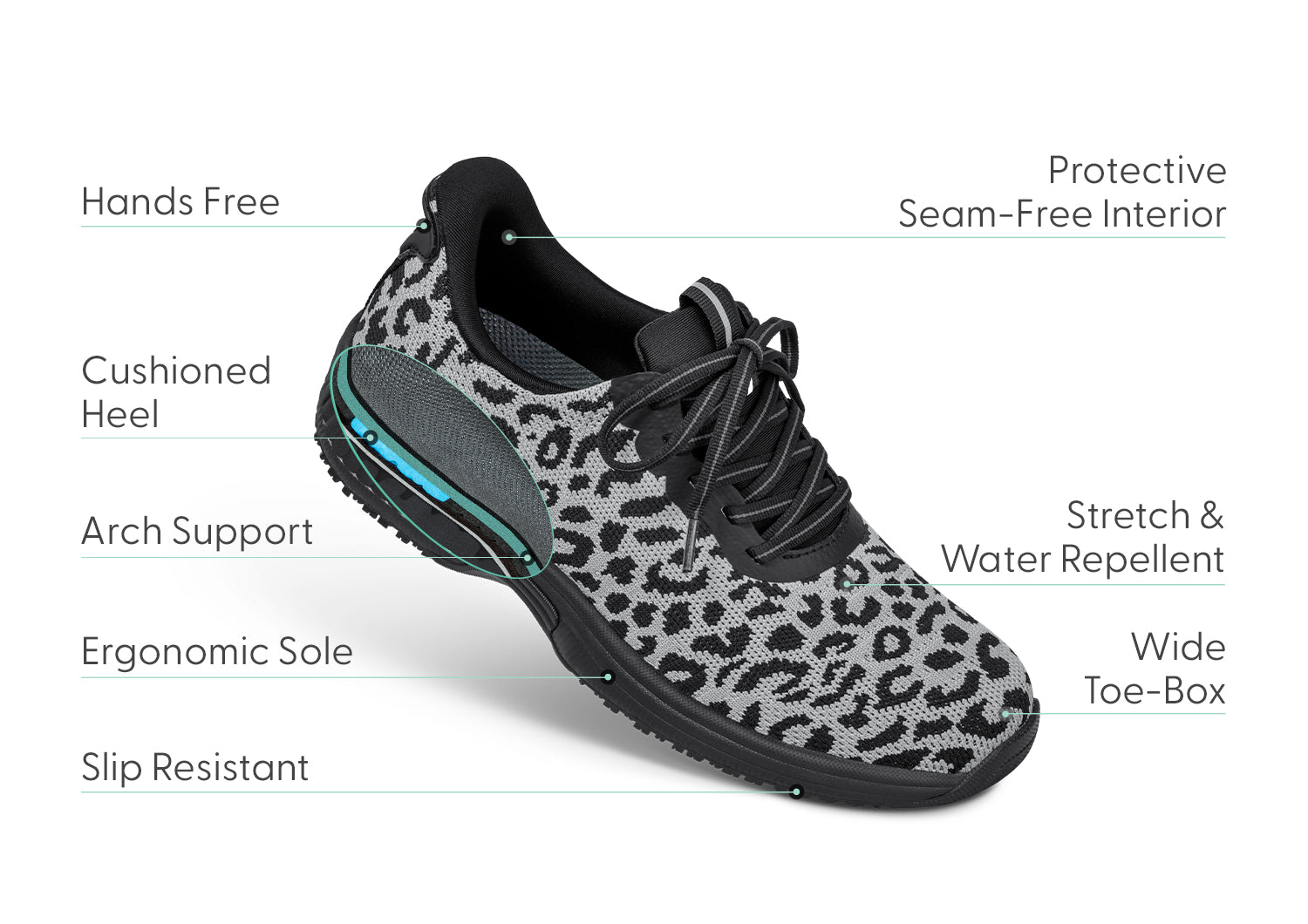 Patented slip-on technology – for hands-free on & off ease.  Eliminates the need to bend over and tie or untie the laces. Our revolutionary heel design keeps footwear from slipping off unexpectedly when walking or running.