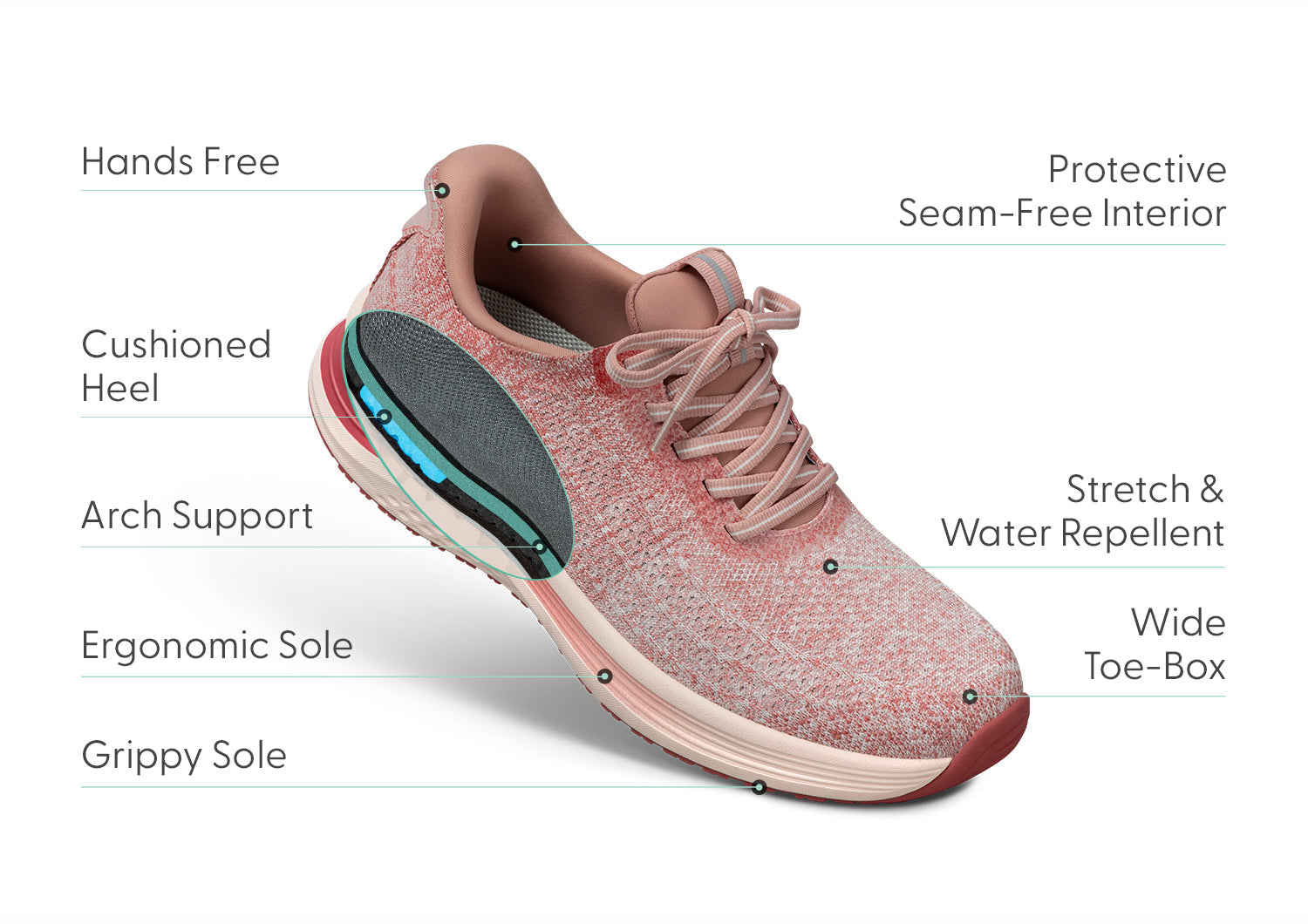Patented slip-on technology – for hands-free on & off ease. Eliminates the need to bend over and tie or untie the laces. Our revolutionary heel design keeps footwear from slipping off unexpectedly when walking or running.