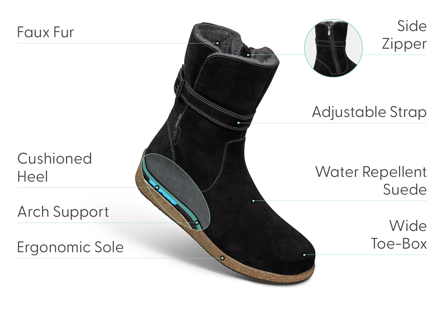 Treat your feet and ankles to cozy comfort and customizable support. With two adjustable straps that open and a tongue that fully opens, these suede boots are easy to get into. And they make sensitive feet happy with a faux fur-lined interior & even the insole! Don't miss a minute of the season, with the adjustable Ortho-Cushion™ System for pressure-free walking.