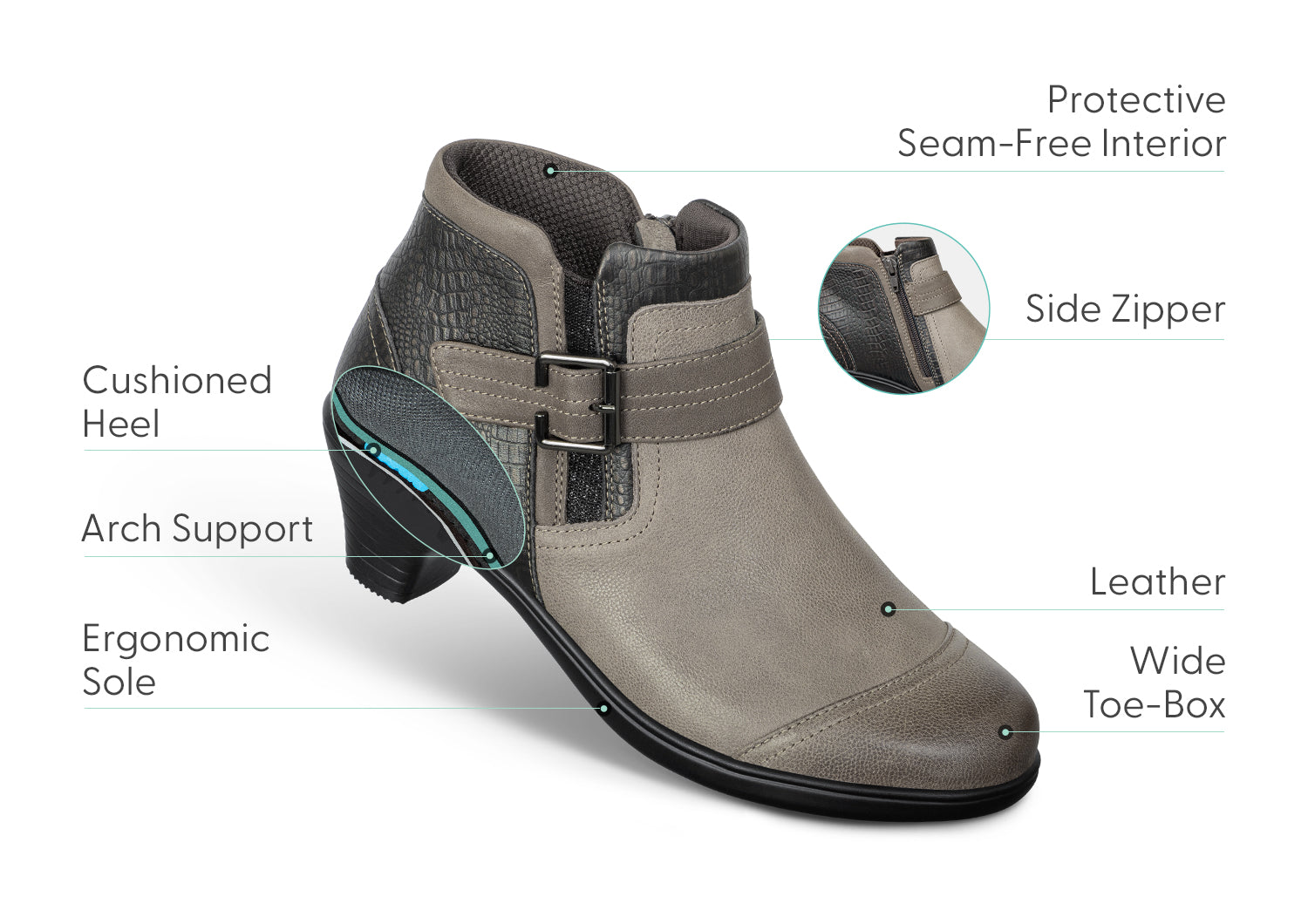 Who knew a stylish leather boot with a two-inch heel could offer the walking comfort of a sneaker and then some? Emma makes the impossible look easy, with Ortho-Cushion™ System support that evenly distributes foot pressure and a roomy toe box to keep every hour pain-free. A zipper for getting in easily and an adjustable strap over stretch gore fit your every move.