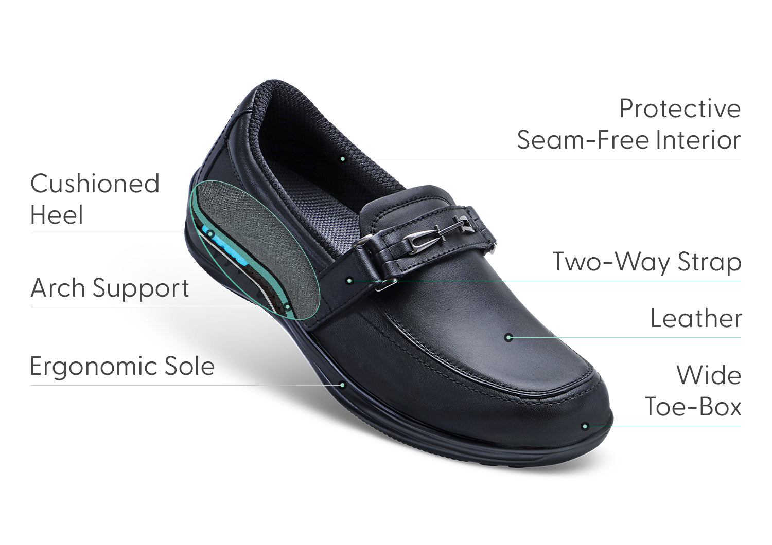 Wide toe-box alleviates pressure on swollen feet, bunions, and hammertoes and allows natural foot movement