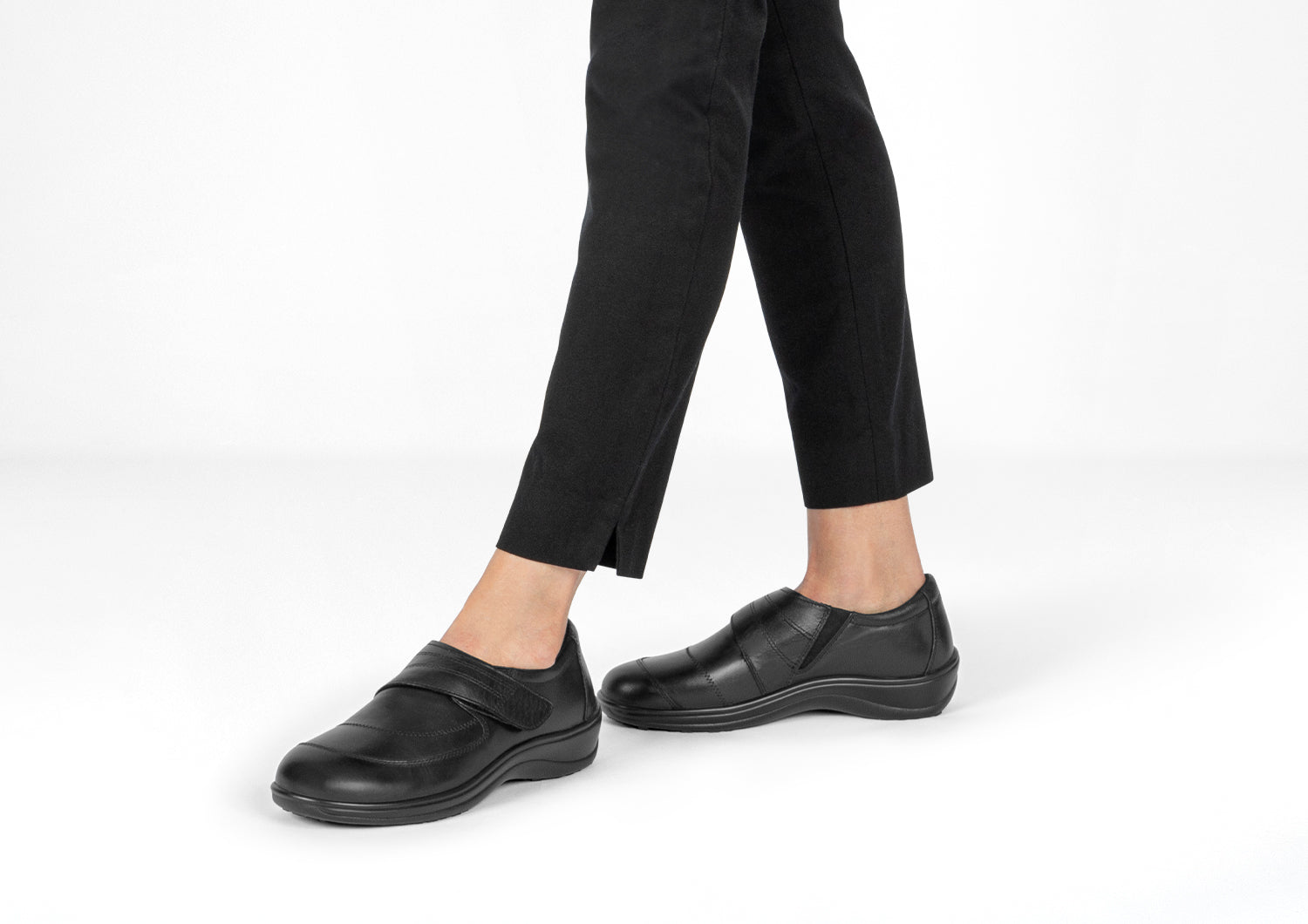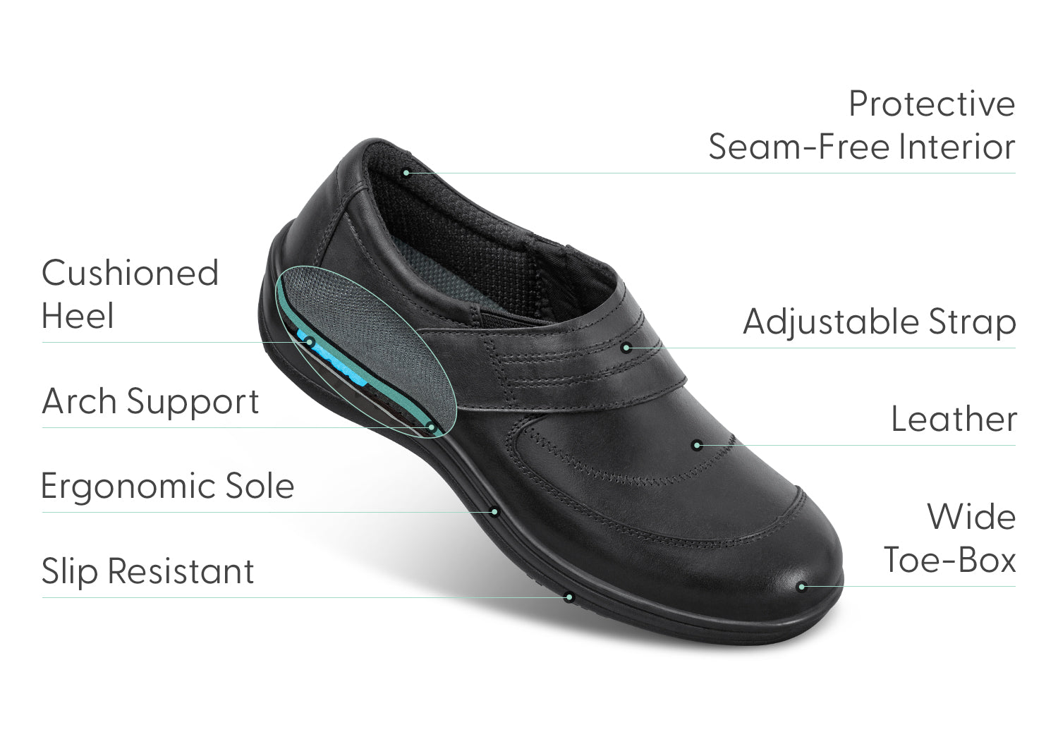 With the supple leather, you'll never sacrifice foot comfort and health to dress well. The adjustable strap opens on either side and the tongue flips up, to make getting in easy. Therapeutic, adjustable support, a padded interior and roomy design prevent foot pressure, while advanced cushioning and walking ergonomics align, stabilize, and soften every step.