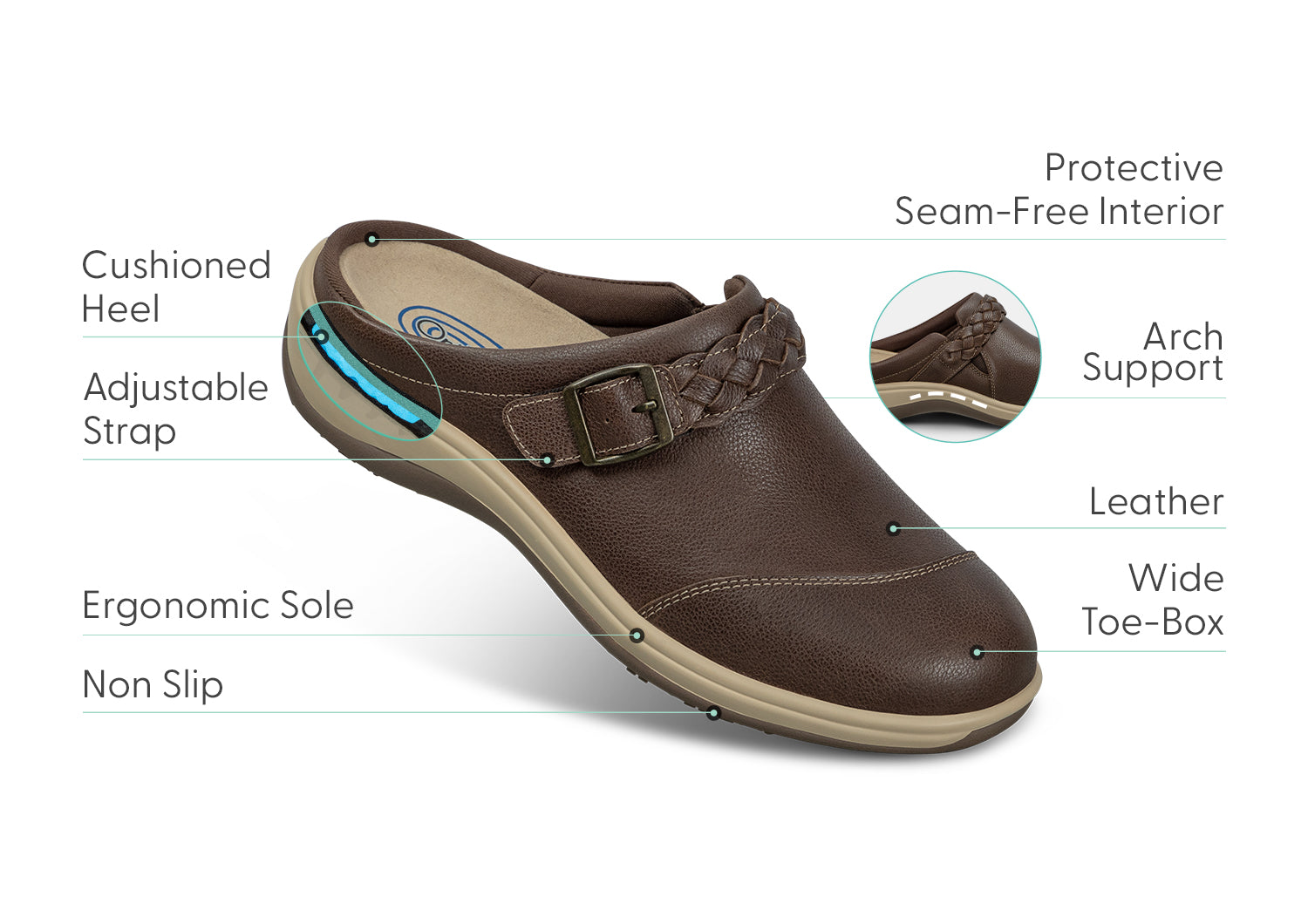 This classic clog sets a new standard for "slide in and go" comfort and support, with advanced features to relieve pain and protect mobility. Just pull open the braided strap to adjust the volume of the leather upper. A padded interior, including heel lip, secures feet. Improve body alignment and reduce walking impact with the advanced Ortho-Cushion™ System.