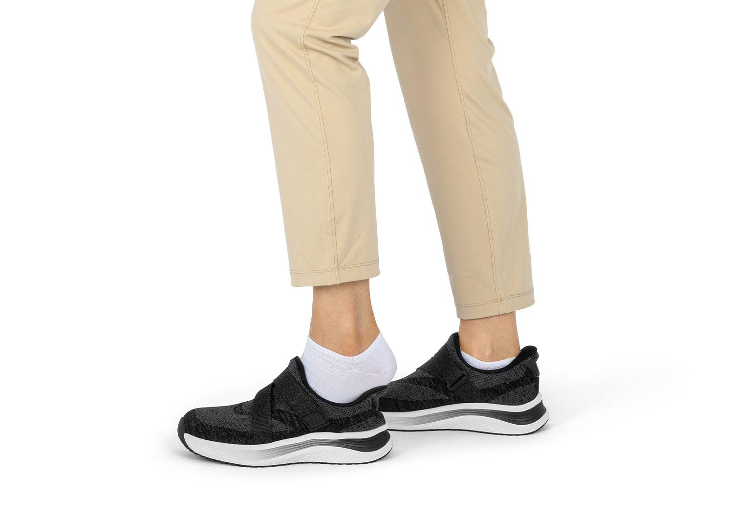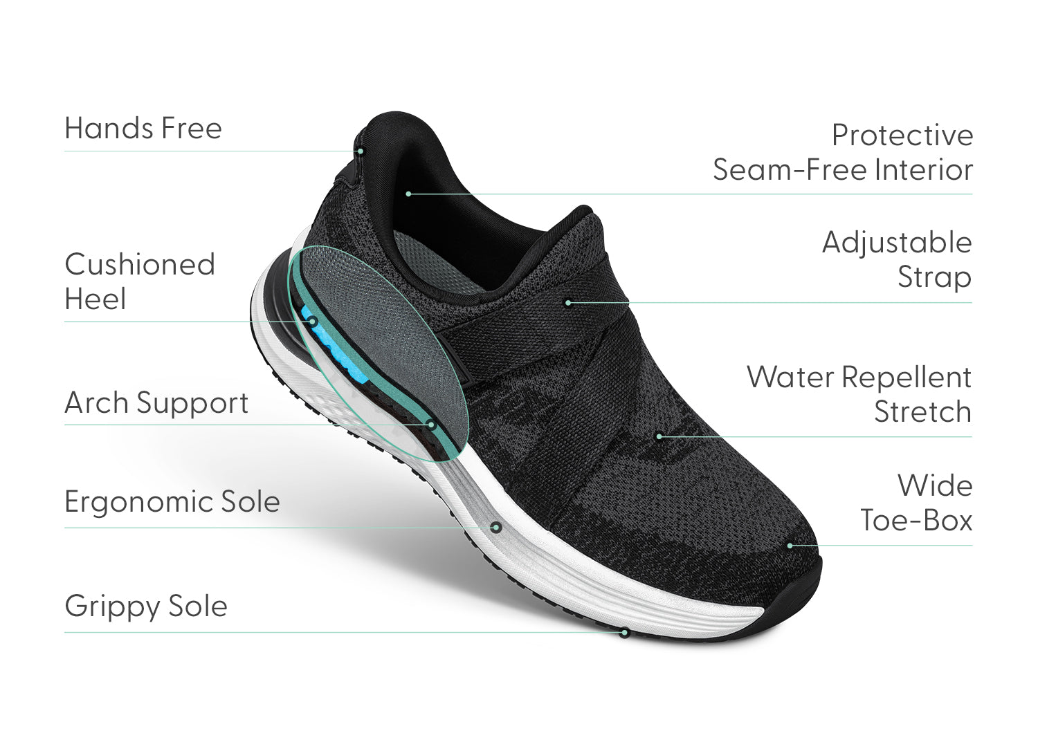 Patented slip-on technology – for hands-free on & off ease. Eliminates the need to bend over and use your hands. Our revolutionary heel design keeps footwear from slipping off unexpectedly when walking or running.