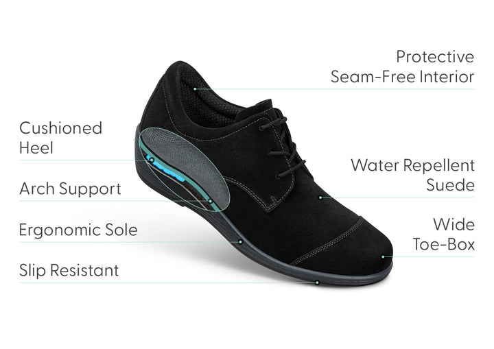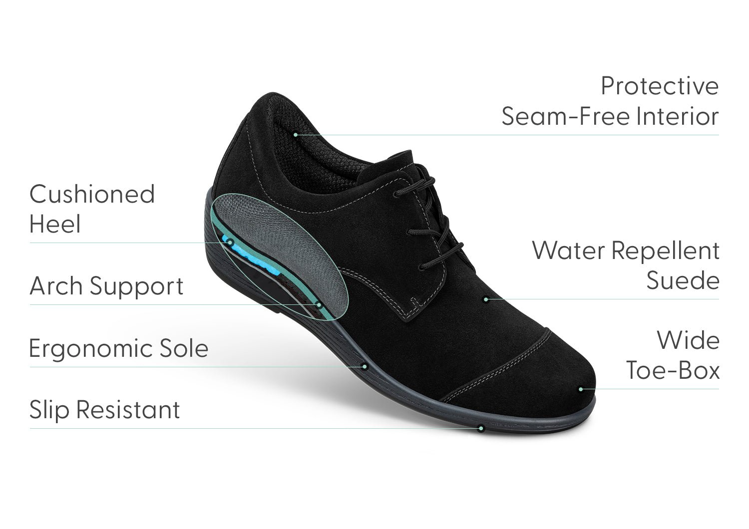 Our modern oxford wedge is uniquely engineered from the ground up to deliver the heel-to-toe walking ease of the Ortho-Cushion™ System in a stylish cork blend wedge heel. A soft water-repellant suede upper and a roomy, soft seam interior protect feet from irritations and pain points. Advanced cushioning and arch support offer therapeutic performance, day and night.
