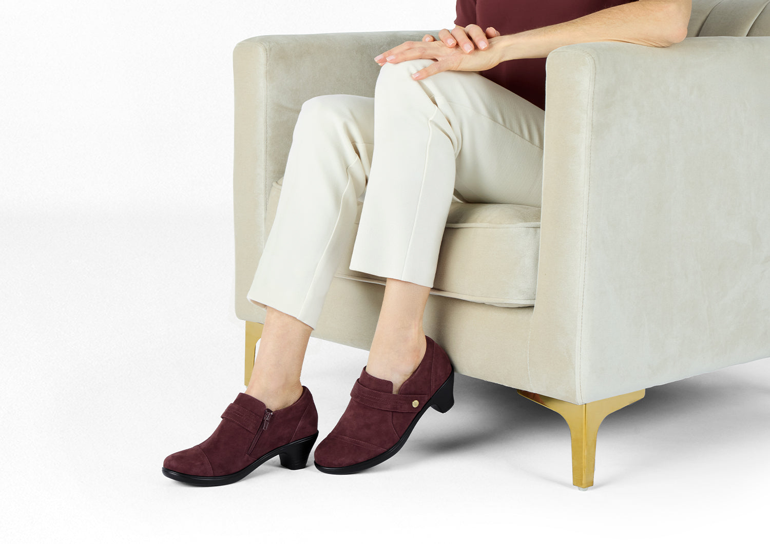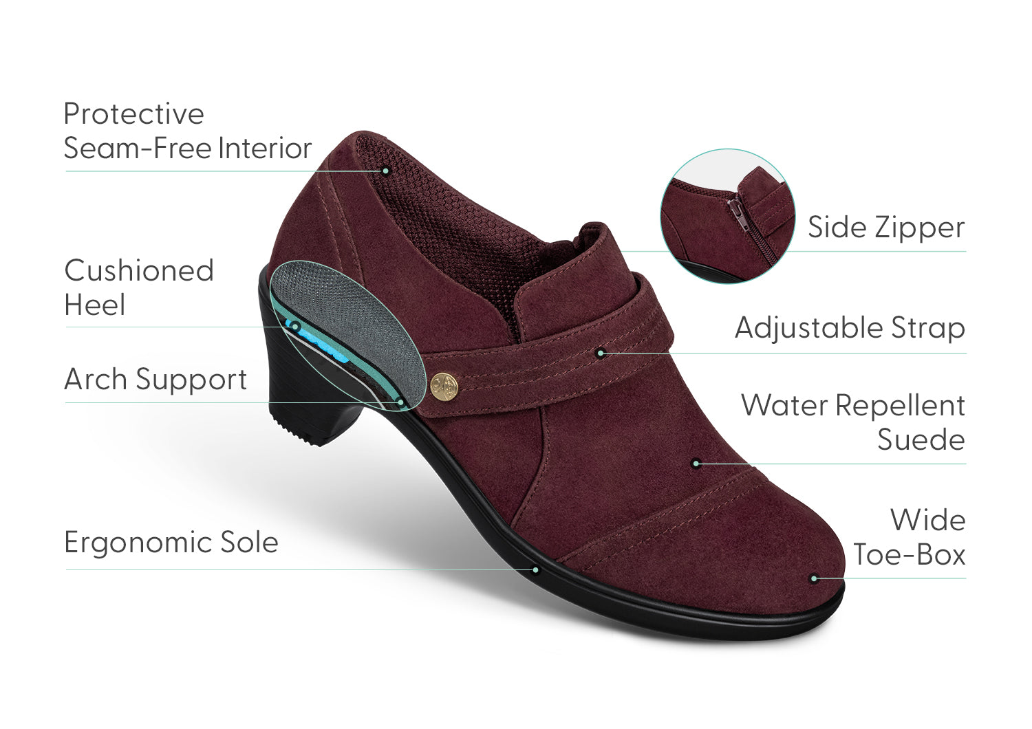 Beautifully good-for-you! We gave the versatile and classy 'shootie' style wedge a major upgrade with ergonomic engineering for supportive alignment and cushioned active comfort. An adjustable strap is the finishing touch to a perfect pressure free fit and pain-relieved walking, even with a foot condition. In soft water-repellant suede, Eva is true everyday luxury.