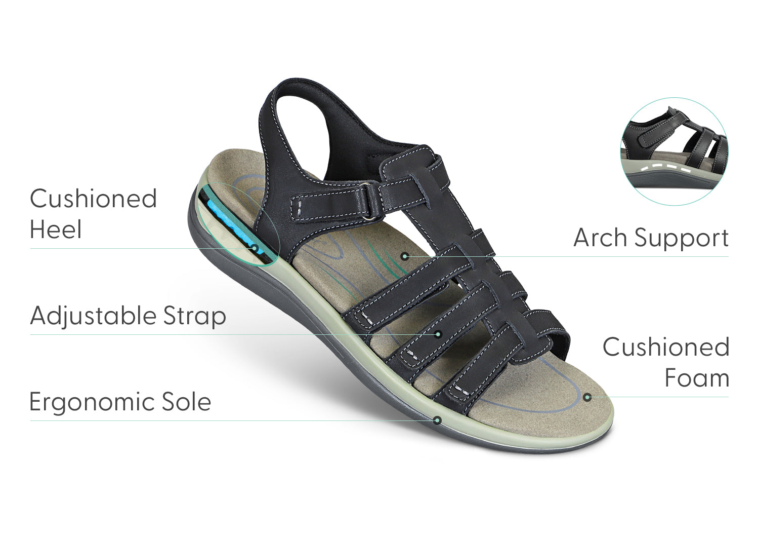 2-way Inset strap can be opened, closed and adjusted from both sides of the sandal for extended adjustability and easier to access medial (inner) side of the sandal, perfect for individuals who have difficulty bending down.