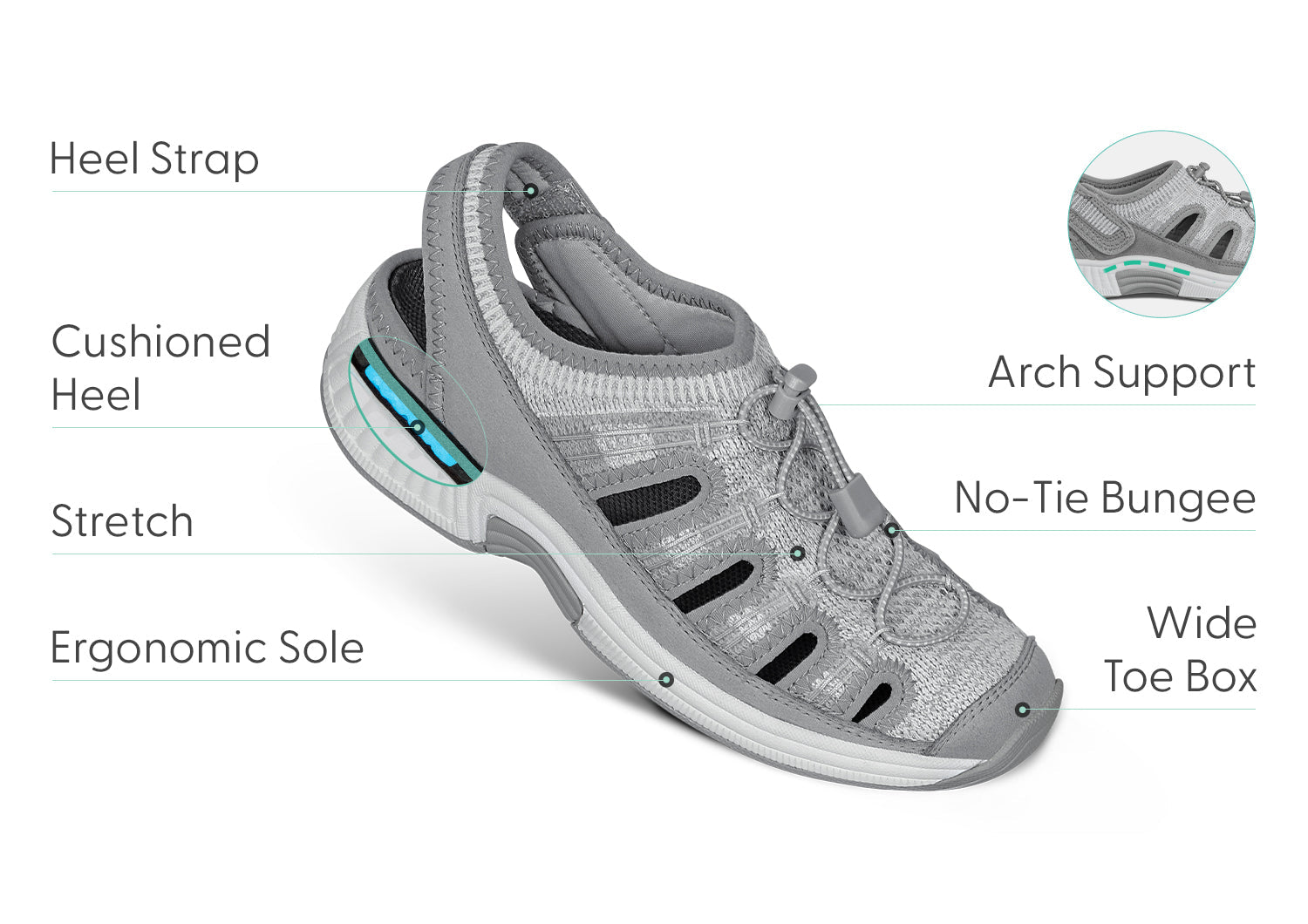Stretchable, breathable fabric upper – provides ventilation and relaxed contoured fit that keeps pressure off conditions such as bunions, hammertoes and swollen feet, and protects sensitive feet, such as those with neuropathy, arthritis and diabetes.