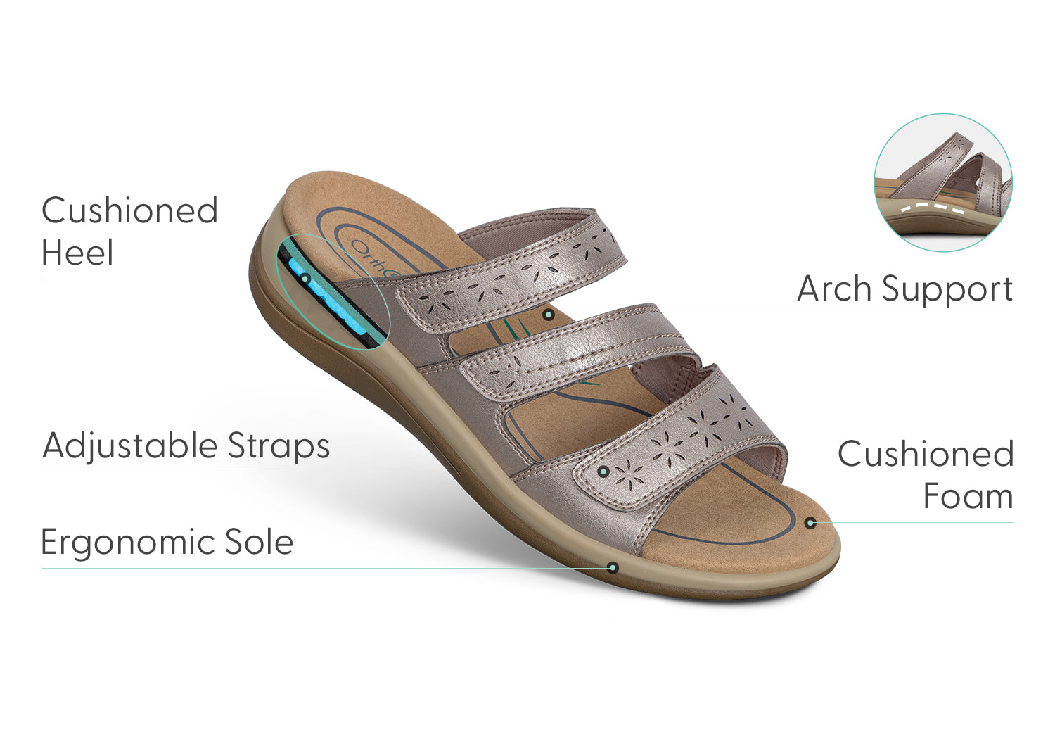 Every comfy strap on our pretty three-strap slide completely opens for true "step-right-in" ease and adjustability that forms to every curve and bump of your foot. Orthofeet's innovative comfort engineering makes going out pain-free, with a foot-hugging fit that keeps you happily in your sandals, not sliding out, for carefree fun under the sun.