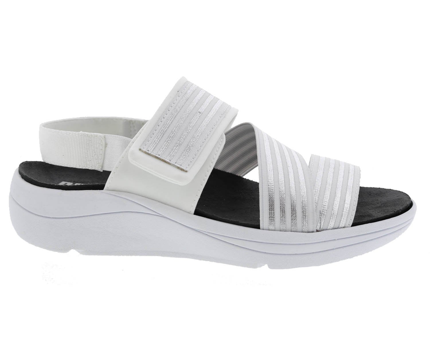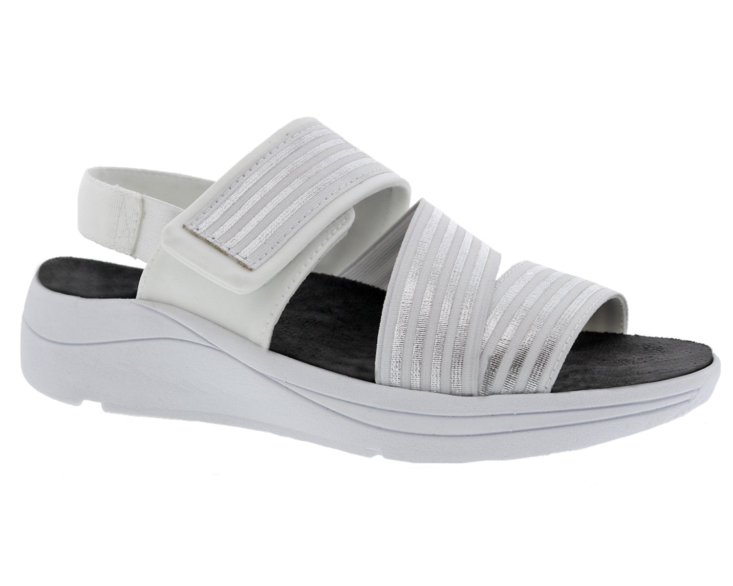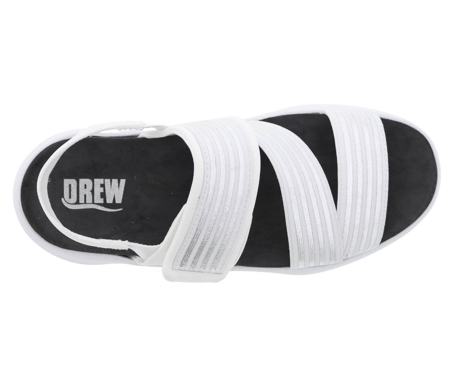 Bring attitude to your look with the Sutton by Drew® sandal. These elastic stretchy strap womens sandals are defined by a stable, slip-resistant sole. The stretch elastic straps provide a flexible, pull-on fit plus adjustable closures so you always have the right fit.  The Walk Right Technology™ footbed has a contoured arch and shock absorbing heel cushion.  It can also be removed to accommodate your custom orthotic.