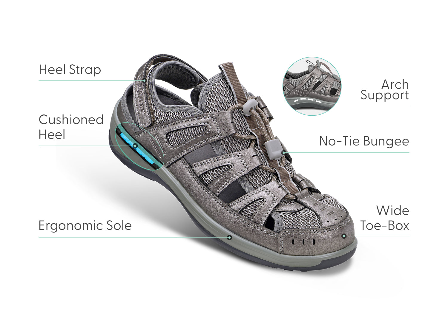 Why choose between warm weather comfort and forefoot protection? These versatile closed-toe sandals make doing-it-all easy and deftly adapt to your foot shape with both a drawstring lace upper and openable, adjustable heel strap. Take every adventure in airy touring style with our smooth walking Ortho-Cushion™ System and padded seam-free interior.