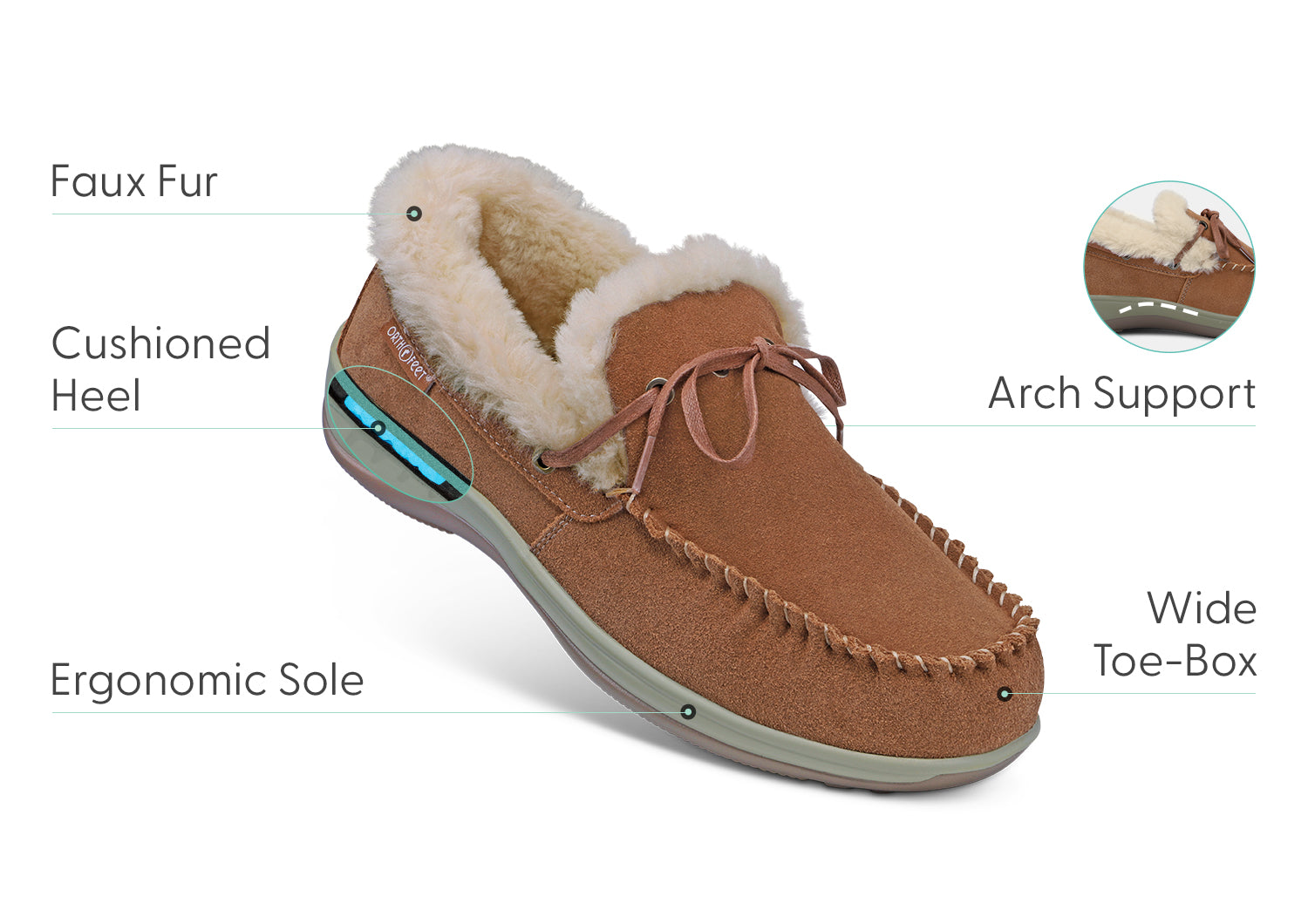 This moccasin slipper for women keeps the whole foot warm, supported and protected from irritation in a fully cushioned, faux fur-lined interior. All the mobility enhancements of the Ortho-Cushion™ System make the Capri the perfect house slipper for keeping homelife active, including a roomy toe box and mild rocker sole for pain-free standing and walking.