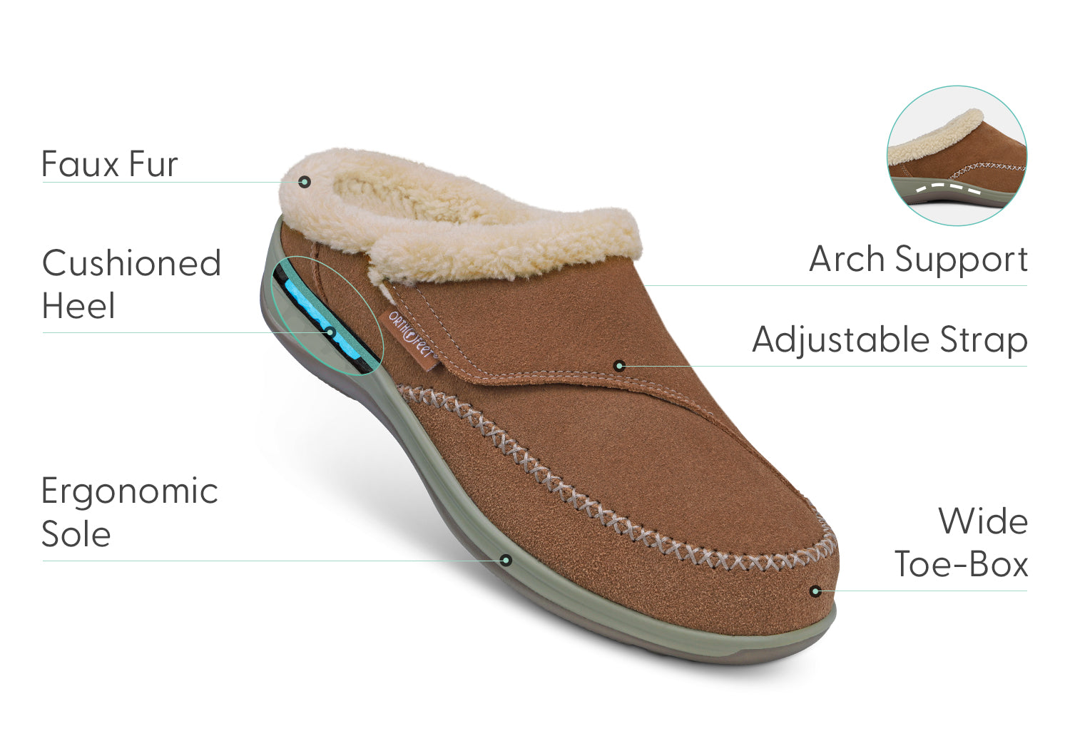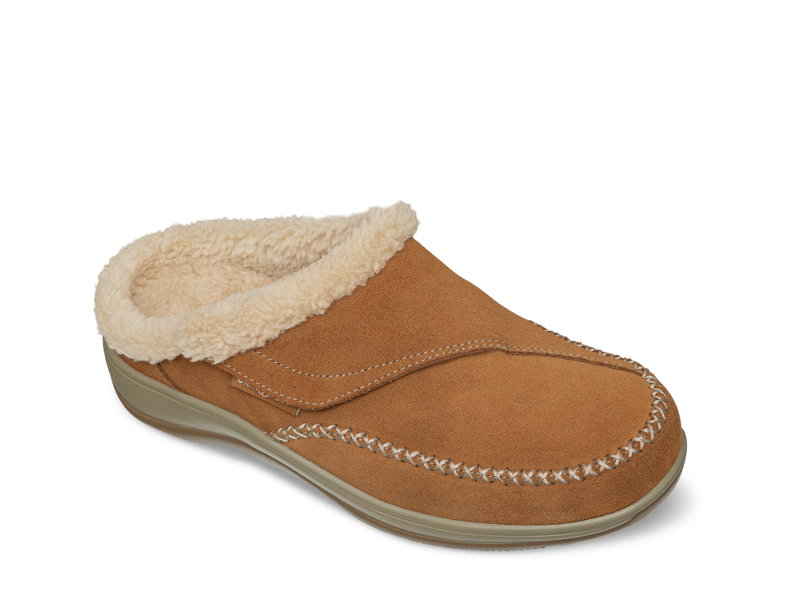 The adjustable side strap on this suede slip-on slipper opens wide to welcome feet into faux fur-lined luxury, with a heel lip that helps keep them on. Under the cozy warmth is full-foot cushioning and pain-relieving support of the Ortho-Cushion™ System. Charlotte's roomy toe box keeps the pressure off sensitive conditions and allows feet to move freely, all around the house.