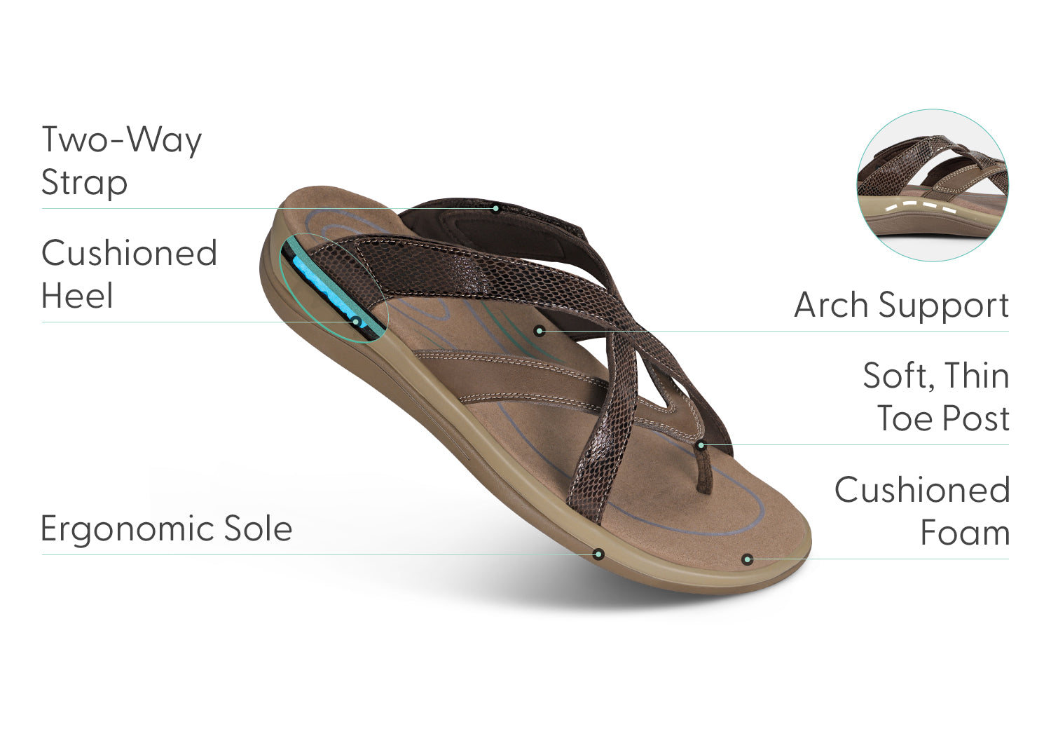 Clio's crisscrossing straps and sleek adjustability take classic flip flops to a new level of contoured comfort. Get all the benefits of our Ortho-Cushion® system, including adjustable arch support. From the toe-post that doesn't irritate between toes to the adjustable padded straps that open on either side of the sandals, the Clio defines effortless style.